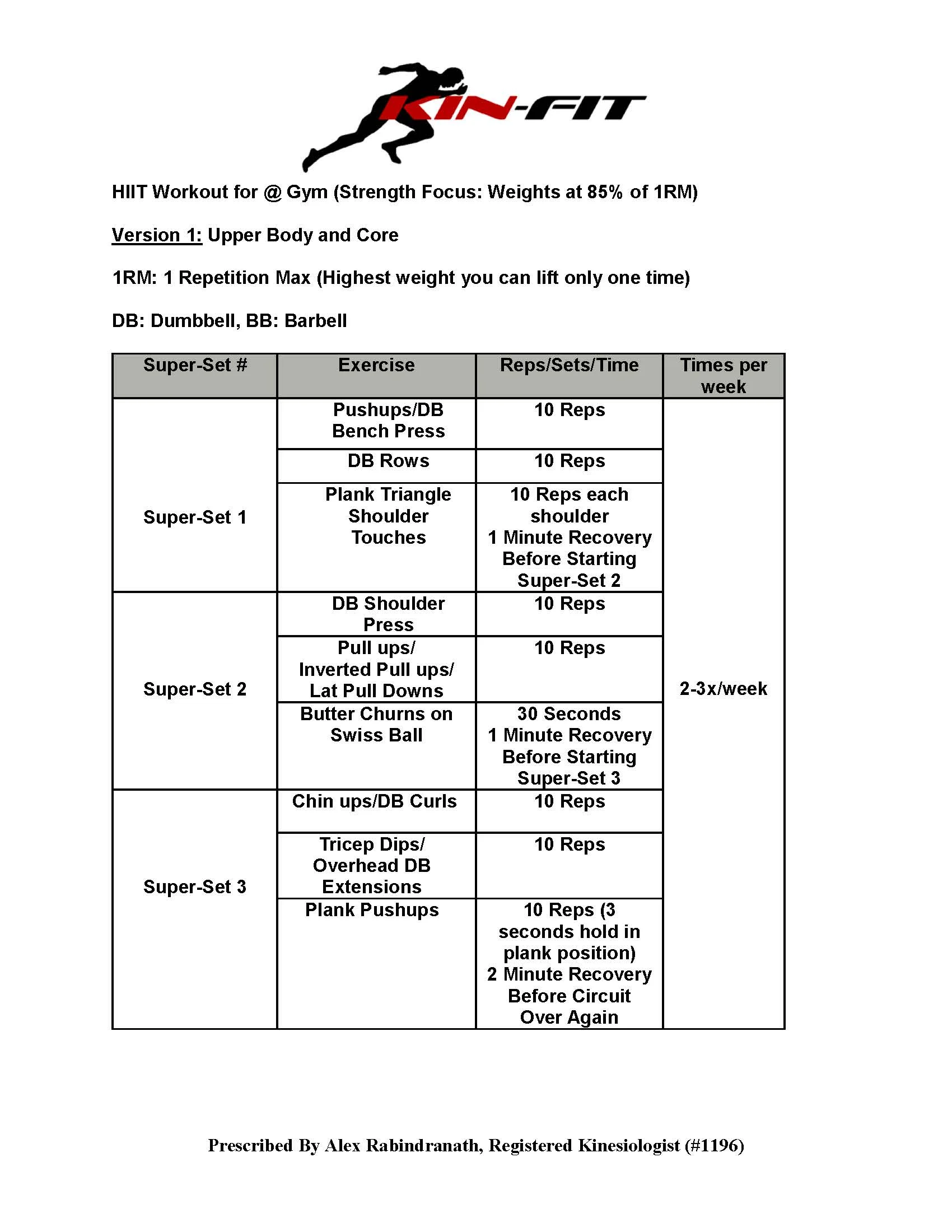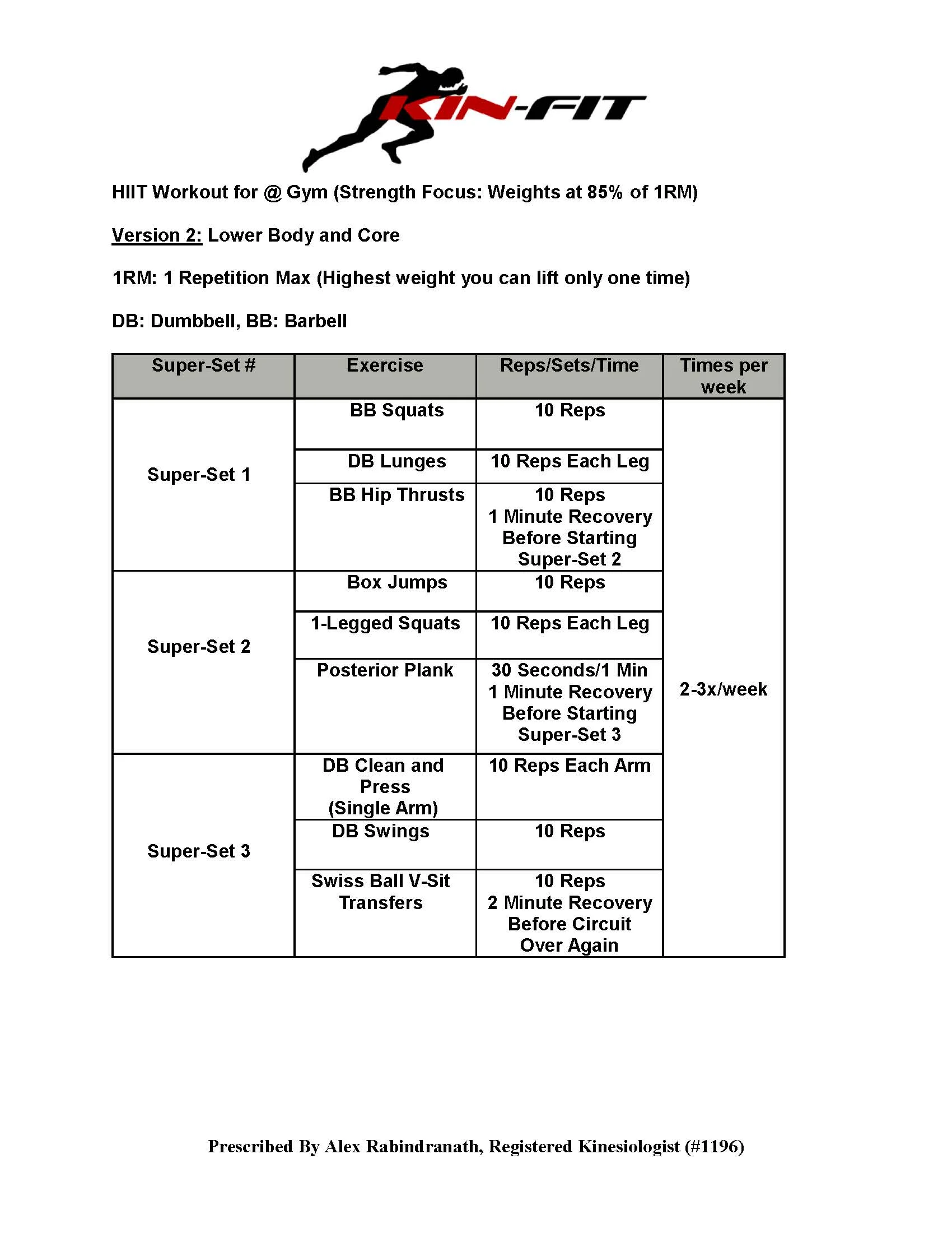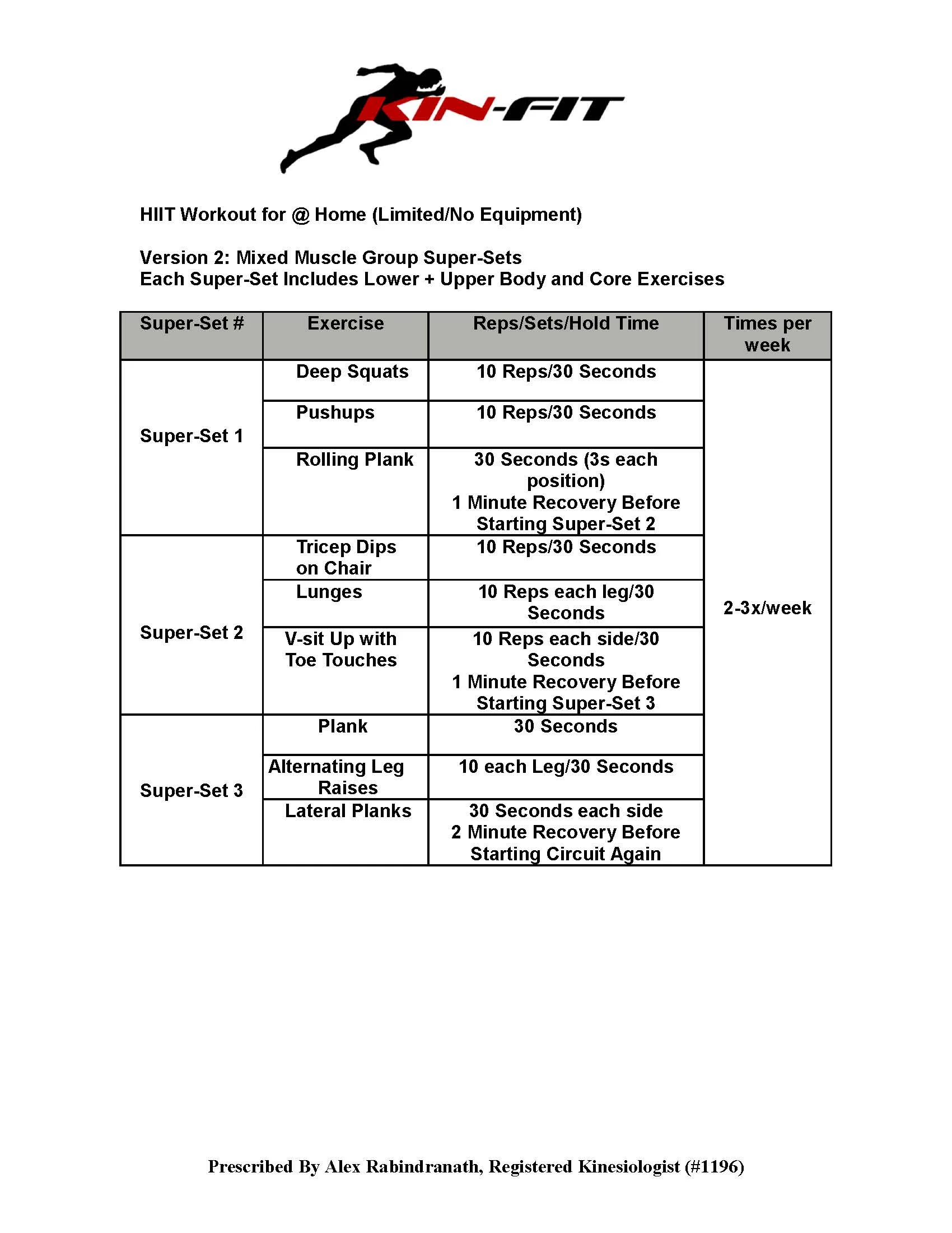 Once you can complete this circuit 2 times comfortably at 10 reps for each exercise, or the allotted time, increase the amount of reps by 5-10 or the time by 10-15 seconds. You can also increase the intensity of these workout by adding weight to the exercise, or swapping in a weight bearing exercise (ex. Swapping push-ups with bench press, or deep squats with barbell squats).